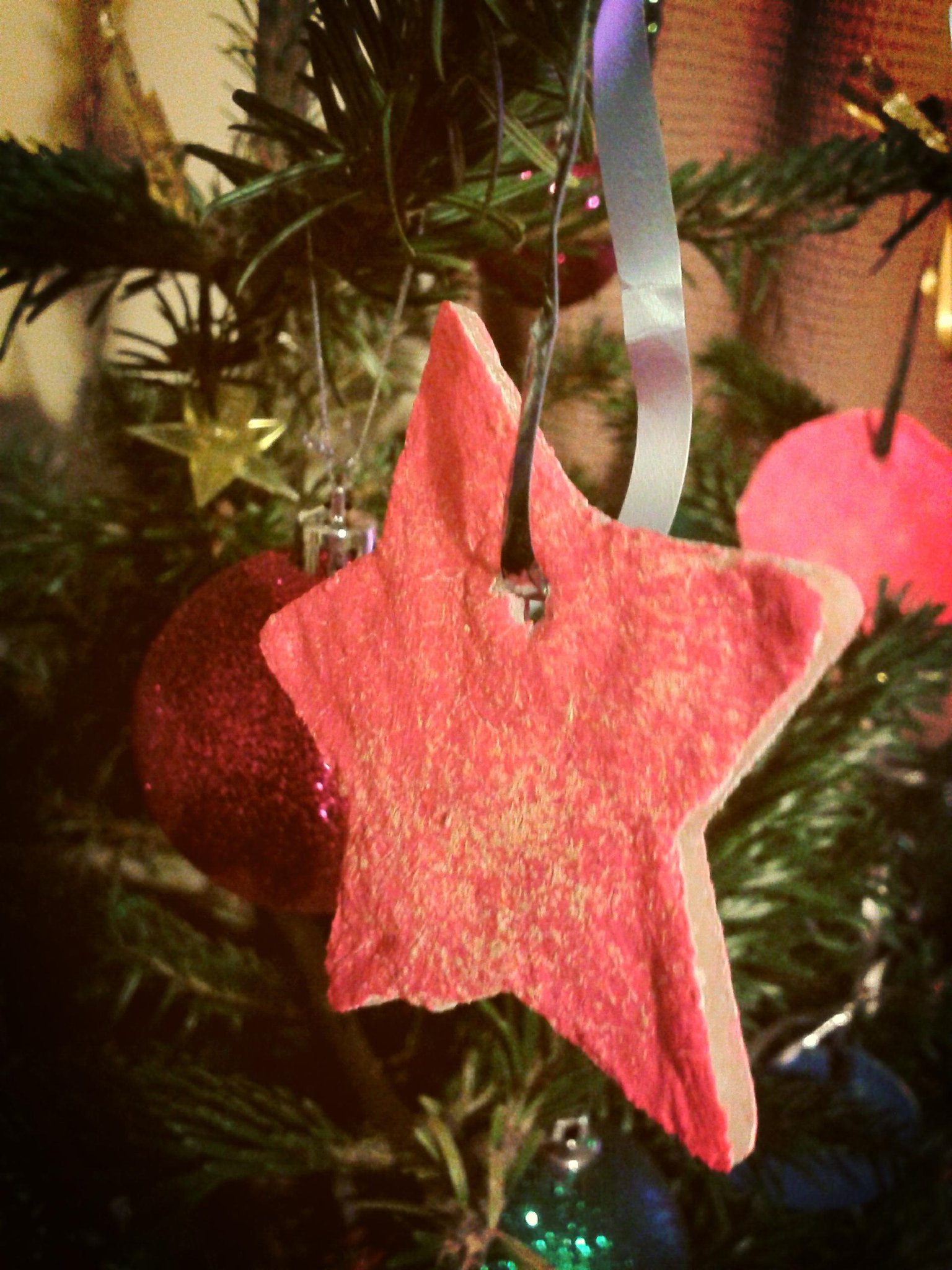 You just need half a cup of salt, half a cup of tepid water and slightly more than a cup of plain flour. Work the dough until its smooth , roll it out, cut out some shapes with a cookie cutter. Jab a hole with a cocktail stick or an old pen and bake in a low oven for a few hours until hard. Then you just paint and add some ribbon or string and hang on the tree. If you are particularly proud of your work seal with a water based varnish or pva glue. And just to be clear salt dough is not for eating.